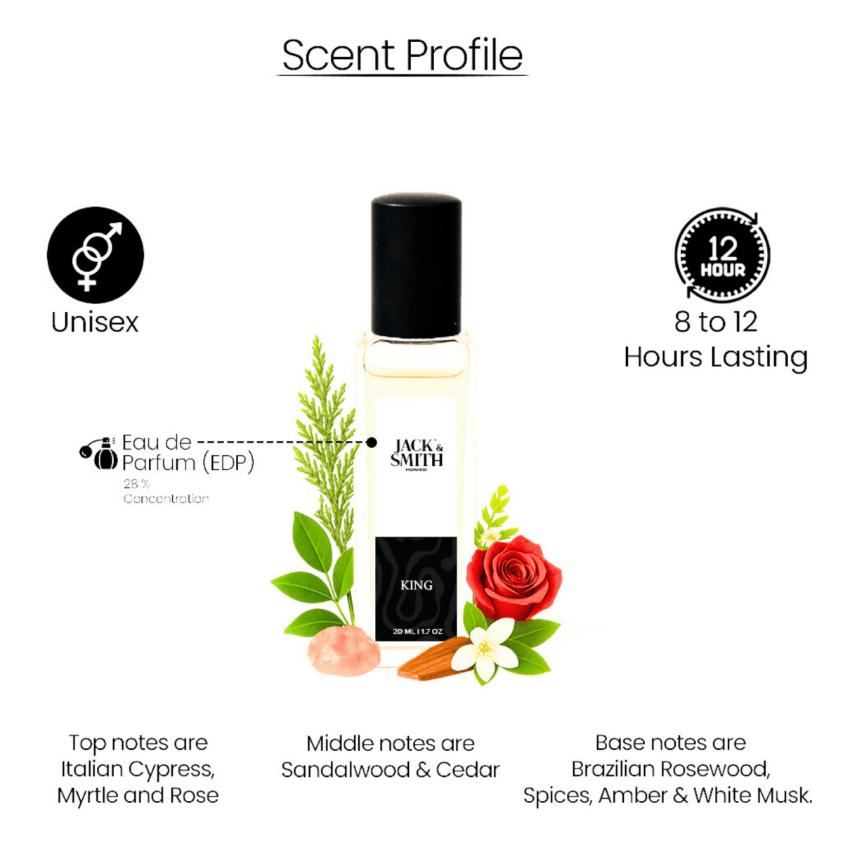 Unleash the power of quiet confidence with KING by Jack & Smith a bold yet refined unisex fragrance crafted for those who embody grace, strength, and timeless charm. This luxurious scent merges woody, floral, and spicy notes into a harmonious expression of elegance and depth.